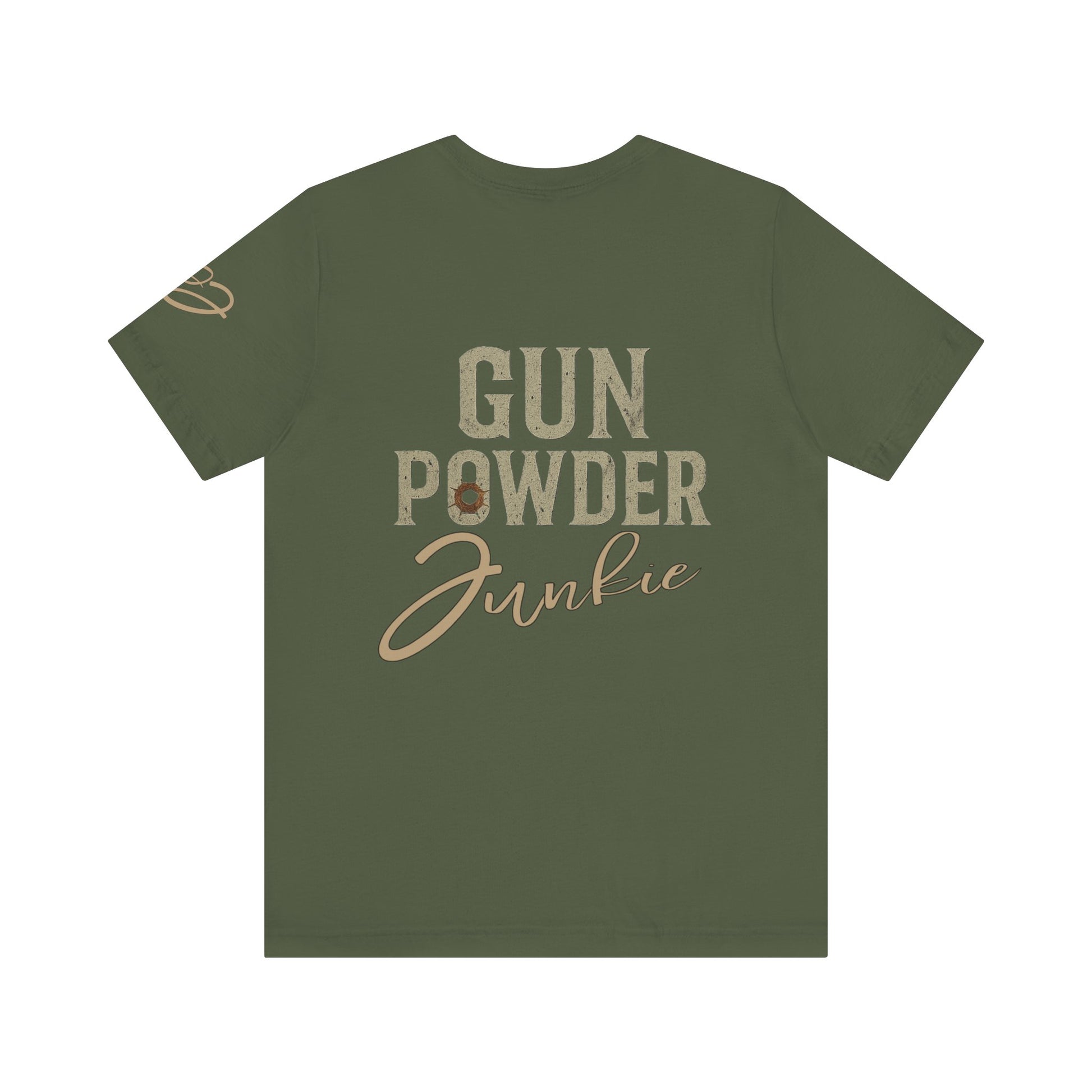 Wear your mindset. This bold black tee features our signature “Gun Powder Junkie” design — distressed lettering, a mushroomed bullet detail in the “O,” and raw grit in every thread.